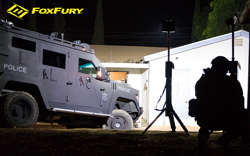 使用電池供電的 FoxFury Nomad® Transformer 場景燈來觀看這一切。Nomad® Transformer 具有內置三腳架,可延伸至 12.9 英尺 (3.9 m) 高,可提供高達 17,600 流明的亮度。這款無線可充電 LED 燈可用作聚光燈、泛光燈或 360° 場景燈,運行時間長達 24 小時。